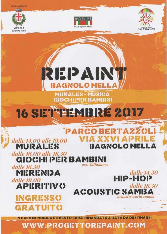 Sabato 16 settembre presso il parco Bertazzoli di Bagnolo Mella iniziativa Anpi nel parco. Tre le attività proposte: murales, giochi per bambini e musica. Buona la partecipazione (pensando al tempo che non si sapeva bene come si comportava) dei bambini, ottimi i murales e magica la musica suonata. Dalle ore 16,00 alle ore 19,00 parecchi bambini e ragazzi hanno potuto giocare con il ludobus di Saltabanco e un laboratorio proposto per i più lenti o per chi in un momento di relax voleva costruire il suo oggetto ludico. Un bel sabato da trascorrere al parco, al parco anche per dire che il gioco è un diritto e gli spazi gioco sono importanti! Si ringraziano gli organizzatori e tutti i partecipanti!