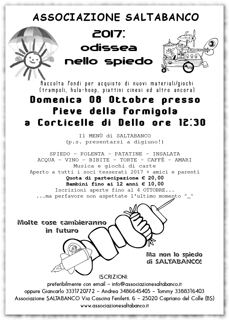 Anche quest'anno Saltabanco organizza lo spiedo raccolta fondi. Oltre alle indicazioni del volantino, Chiara raccoglie le iscrizioni al 3404030306
