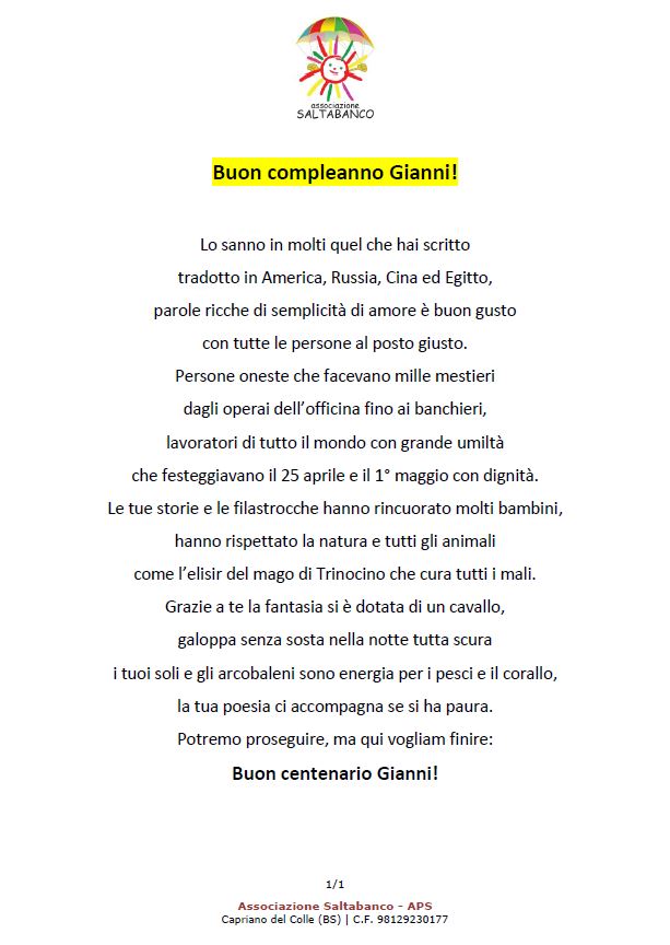 Oggi 23 ottobre 2020 è il centenario della nascita di Gianni Rodari, Saltabanco dedica questa filastrocca scritta dai soci per questo evento da ricordare!